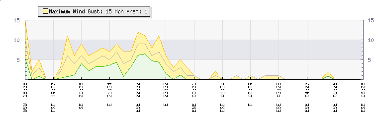 In the last few minutes the wind was East South East at an average speed of 0 mph, reaching up to 0 mph and a low of 0 mph. The gust strength is0 mph above the minimum speed |