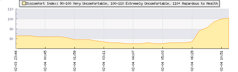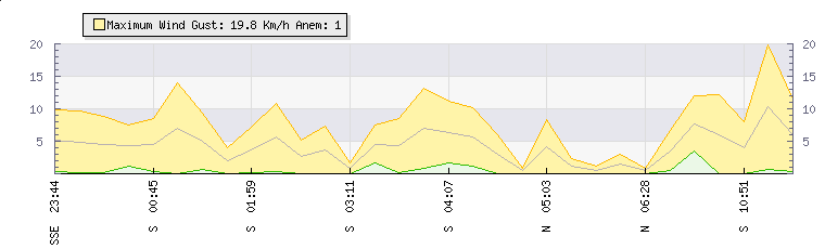 In the last few minutes the wind was Northerly at an average speed of 8 kmh, reaching up to 12 kmh and a low of 3 kmh. The gust strength is9 kmh above the minimum speed |