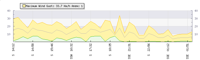 In the last few minutes the wind was Southerly at an average speed of 5 kmh, reaching up to 10 kmh and a low of 0 kmh. The gust strength is10 kmh above the minimum speed |
