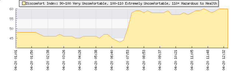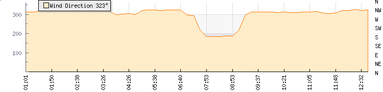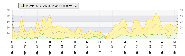 In the last few minutes the wind was North Westerly at an average speed of 26 kmh, reaching up to 45 kmh and a low of 7 kmh. The gust strength is38 kmh above the minimum speed |