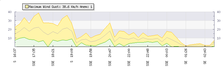 In the last few minutes the wind was South South East at an average speed of 8 kmh, reaching up to 17 kmh and a low of 0 kmh. The gust strength is17 kmh above the minimum speed |