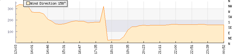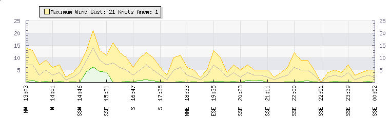 In the last few minutes the wind was South South East at an average speed of 4 knots, reaching up to 7 knots and a low of 0 knots. The gust strength is7 knots above the minimum speed |