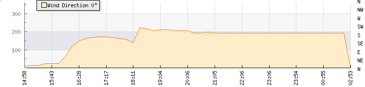 In the last few minutes the wind was South South West at an average speed of 0 knots, reaching up to 0 knots and a low of 0 knots. The gust strength is0 knots above the minimum speed |