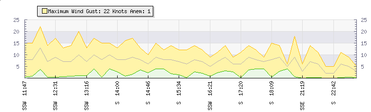 In the last few minutes the wind was South South East at an average speed of 7 knots, reaching up to 14 knots and a low of 0 knots. The gust strength is14 knots above the minimum speed |