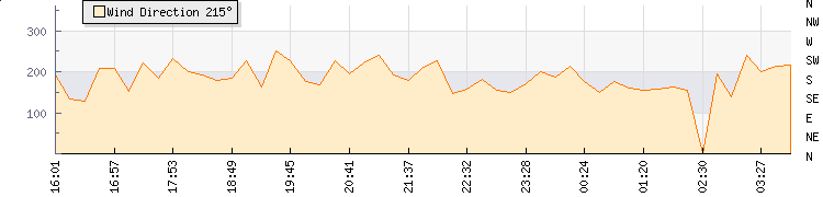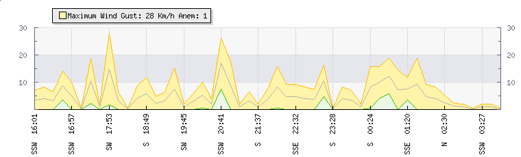 In the last few minutes the wind was South South East at an average speed of 8 kmh, reaching up to 12 kmh and a low of 4 kmh. The gust strength is8 kmh above the minimum speed |