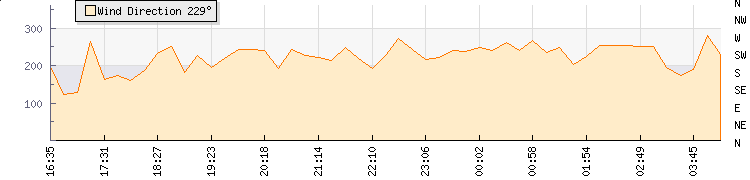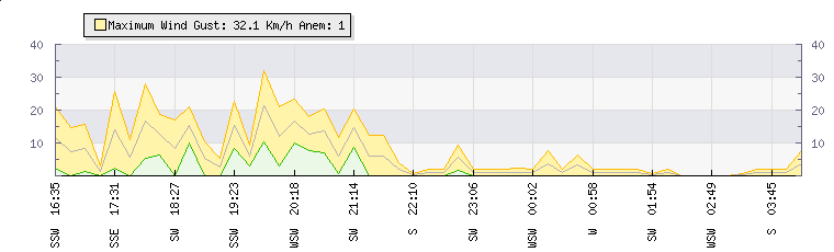 In the last few minutes the wind was West South West at an average speed of 0 kmh, reaching up to 0 kmh and a low of 0 kmh. The gust strength is0 kmh above the minimum speed |