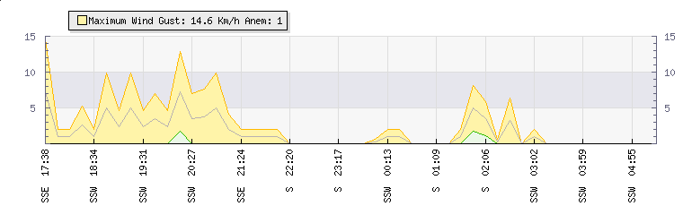 In the last few minutes the wind was South South West at an average speed of 0 kmh, reaching up to 0 kmh and a low of 0 kmh. The gust strength is0 kmh above the minimum speed |