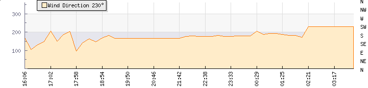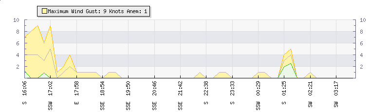 In the last few minutes the wind was Southerly at an average speed of 0 knots, reaching up to 0 knots and a low of 0 knots. The gust strength is0 knots above the minimum speed |