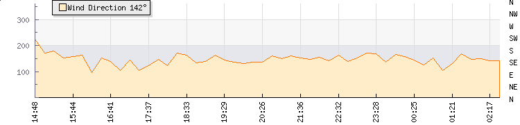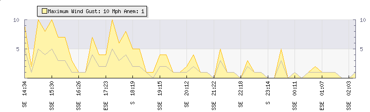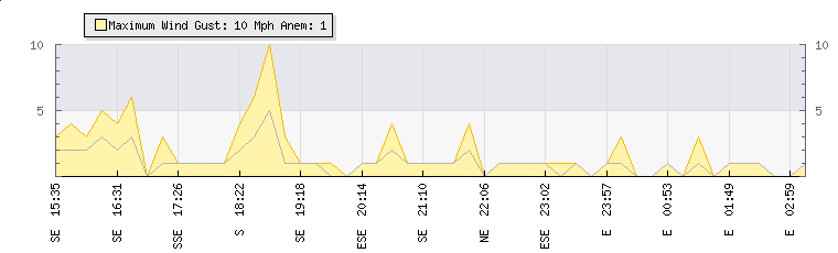 In the last few minutes the wind was Easterly at an average speed of 0 mph, reaching up to 0 mph and a low of 0 mph. The gust strength is0 mph above the minimum speed |