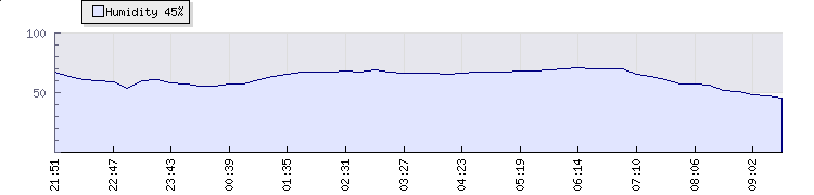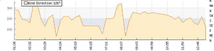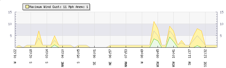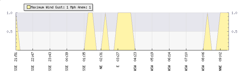 In the last few minutes the wind was South Westerly at an average speed of 1 mph, reaching up to 1 mph and a low of 0 mph. The gust strength is1 mph above the minimum speed |