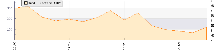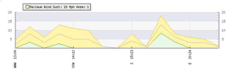 In the last few minutes the wind was East South East at an average speed of 1 mph, reaching up to 1 mph and a low of 0 mph. The gust strength is1 mph above the minimum speed |
