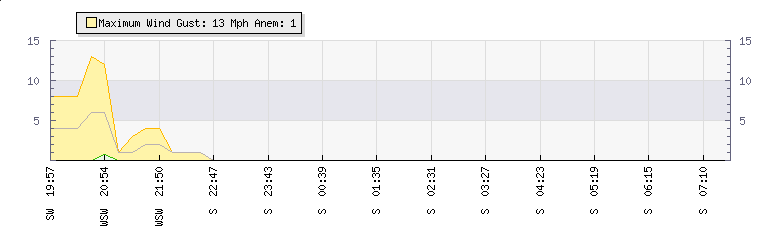 In the last few minutes the wind was Southerly at an average speed of 0 mph, reaching up to 0 mph and a low of 0 mph. The gust strength is0 mph above the minimum speed |