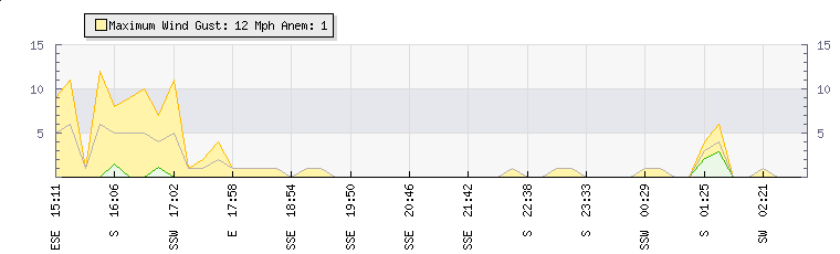 In the last few minutes the wind was Southerly at an average speed of 3 mph, reaching up to 4 mph and a low of 2 mph. The gust strength is2 mph above the minimum speed |