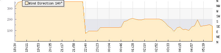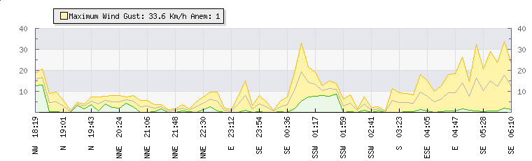 In the last few minutes the wind was North North East at an average speed of 5 kmh, reaching up to 8 kmh and a low of 3 kmh. The gust strength is5 kmh above the minimum speed |