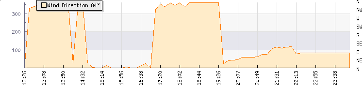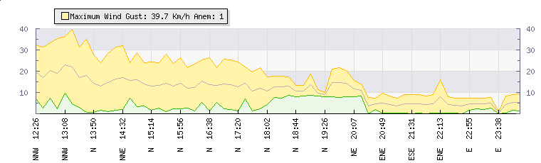 In the last few minutes the wind was Easterly at an average speed of 5 kmh, reaching up to 7 kmh and a low of 2 kmh. The gust strength is5 kmh above the minimum speed |