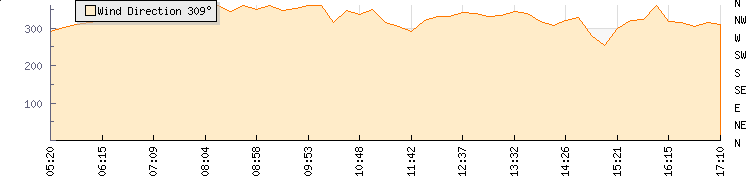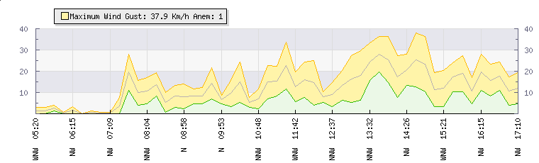 In the last few minutes the wind was North Westerly at an average speed of 17 kmh, reaching up to 24 kmh and a low of 11 kmh. The gust strength is13 kmh above the minimum speed |