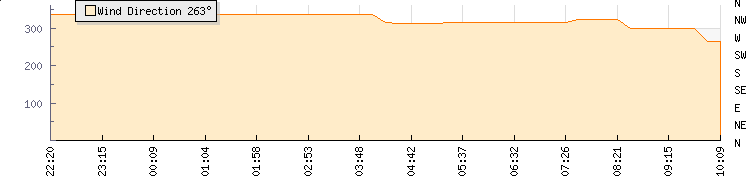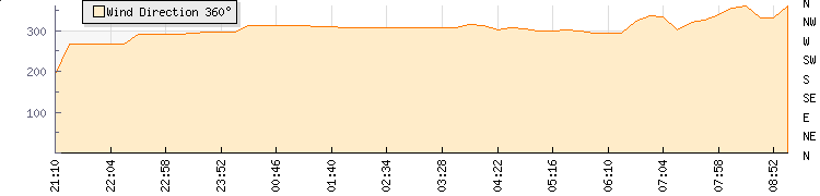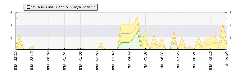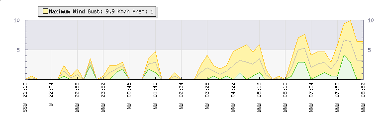 In the last few minutes the wind was West North West at an average speed of 1 kmh, reaching up to 1 kmh and a low of 0 kmh. The gust strength is1 kmh above the minimum speed |