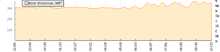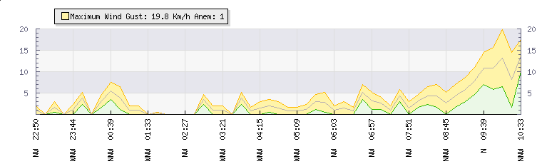 In the last few minutes the wind was North Westerly at an average speed of 6 kmh, reaching up to 9 kmh and a low of 3 kmh. The gust strength is6 kmh above the minimum speed |