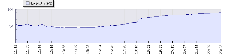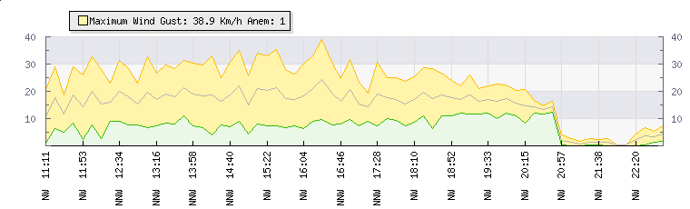 In the last few minutes the wind was North Westerly at an average speed of 14 kmh, reaching up to 16 kmh and a low of 12 kmh. The gust strength is4 kmh above the minimum speed |