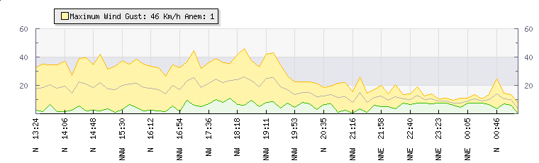 In the last few minutes the wind was North North East at an average speed of 10 kmh, reaching up to 14 kmh and a low of 7 kmh. The gust strength is7 kmh above the minimum speed |