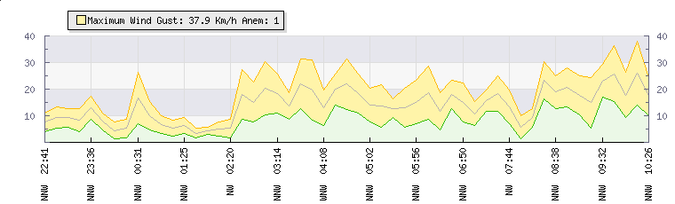 In the last few minutes the wind was Northerly at an average speed of 15 kmh, reaching up to 25 kmh and a low of 5 kmh. The gust strength is20 kmh above the minimum speed |