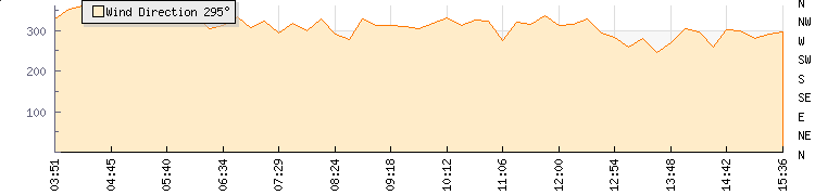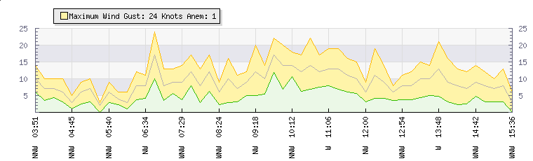 In the last few minutes the wind was West North West at an average speed of 9 knots, reaching up to 16 knots and a low of 3 knots. The gust strength is13 knots above the minimum speed |