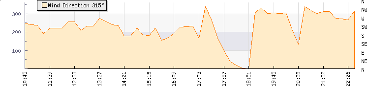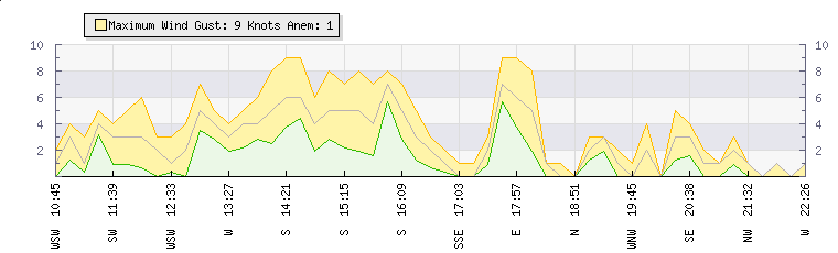 In the last few minutes the wind was North North West at an average speed of 1 knots, reaching up to 2 knots and a low of 0 knots. The gust strength is2 knots above the minimum speed |
