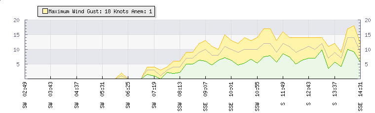 In the last few minutes the wind was South Easterly at an average speed of 12 knots, reaching up to 14 knots and a low of 10 knots. The gust strength is4 knots above the minimum speed |