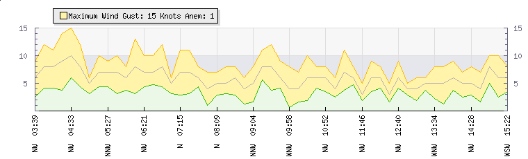 In the last few minutes the wind was North Westerly at an average speed of 5 knots, reaching up to 7 knots and a low of 3 knots. The gust strength is4 knots above the minimum speed |