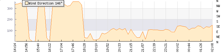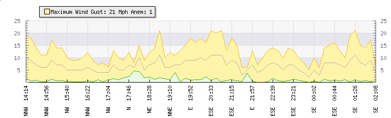 In the last few minutes the wind was South Easterly at an average speed of 9 mph, reaching up to 19 mph and a low of 0 mph. The gust strength is19 mph above the minimum speed |