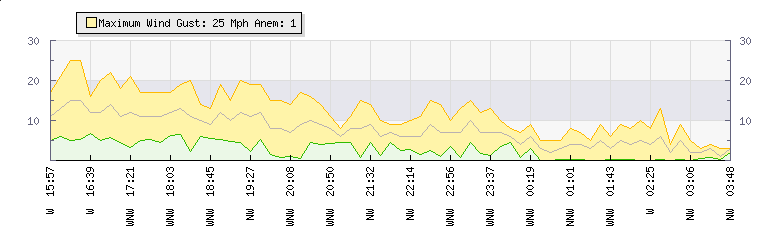 In the last few minutes the wind was West North West at an average speed of 9 mph, reaching up to 15 mph and a low of 2 mph. The gust strength is13 mph above the minimum speed |