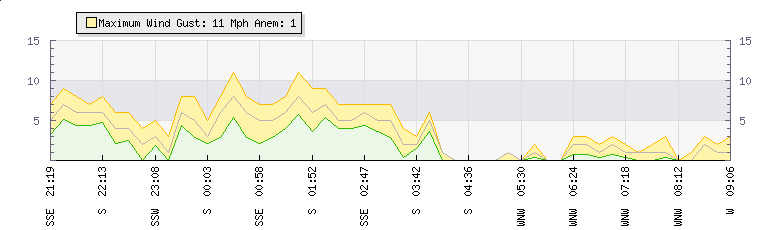 In the last few minutes the wind was West North West at an average speed of 1 mph, reaching up to 2 mph and a low of 0 mph. The gust strength is2 mph above the minimum speed |