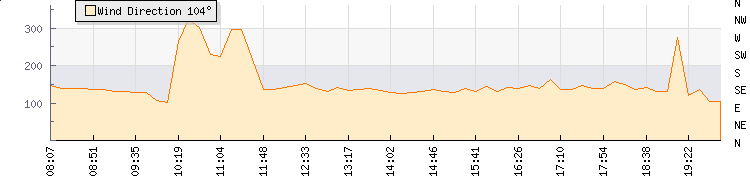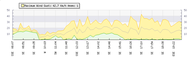 In the last few minutes the wind was South Easterly at an average speed of 19 kmh, reaching up to 37 kmh and a low of 1 kmh. The gust strength is36 kmh above the minimum speed |