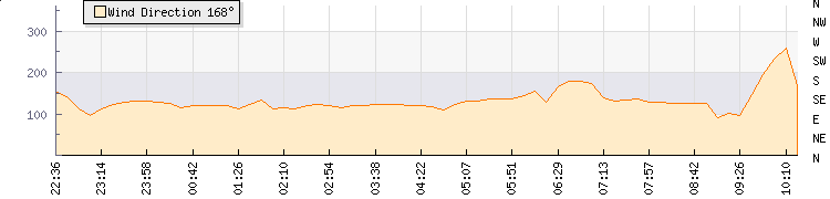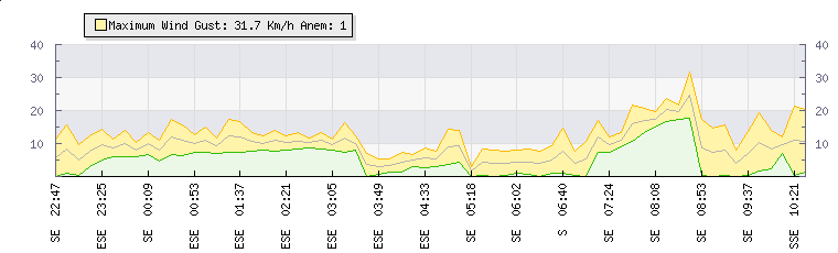 In the last few minutes the wind was South Easterly at an average speed of 20 kmh, reaching up to 22 kmh and a low of 17 kmh. The gust strength is5 kmh above the minimum speed |
