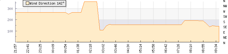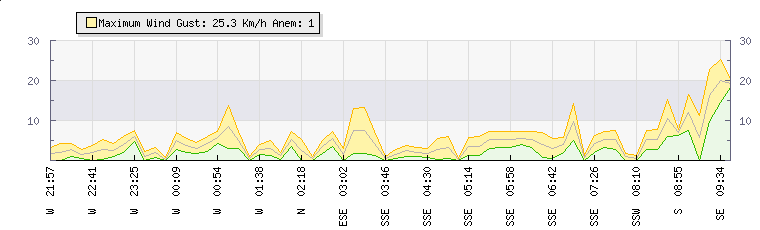 In the last few minutes the wind was South South West at an average speed of 5 kmh, reaching up to 8 kmh and a low of 3 kmh. The gust strength is5 kmh above the minimum speed |