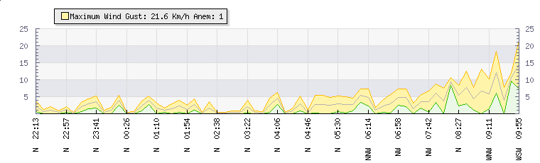 In the last few minutes the wind was North North East at an average speed of 4 kmh, reaching up to 8 kmh and a low of 0 kmh. The gust strength is8 kmh above the minimum speed |