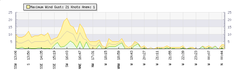 In the last few minutes the wind was Westerly at an average speed of 1 knots, reaching up to 1 knots and a low of 0 knots. The gust strength is1 knots above the minimum speed |