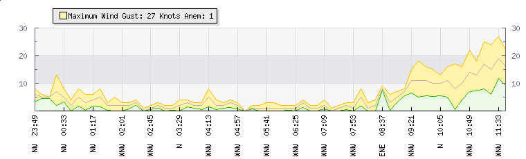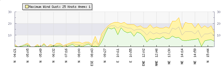 In the last few minutes the wind was North North West at an average speed of 13 knots, reaching up to 20 knots and a low of 6 knots. The gust strength is14 knots above the minimum speed |