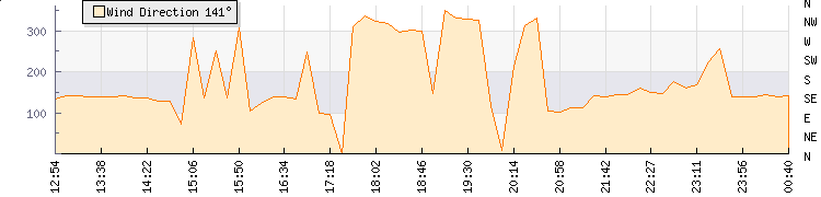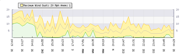 In the last few minutes the wind was South Easterly at an average speed of 5 mph, reaching up to 10 mph and a low of 0 mph. The gust strength is10 mph above the minimum speed |