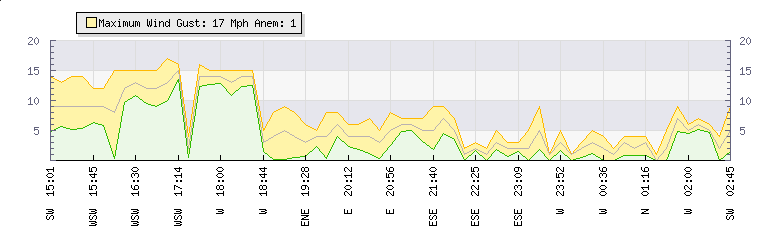 In the last few minutes the wind was Northerly at an average speed of 3 mph, reaching up to 4 mph and a low of 1 mph. The gust strength is3 mph above the minimum speed |