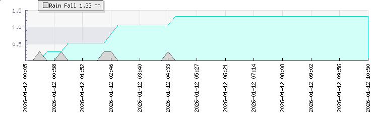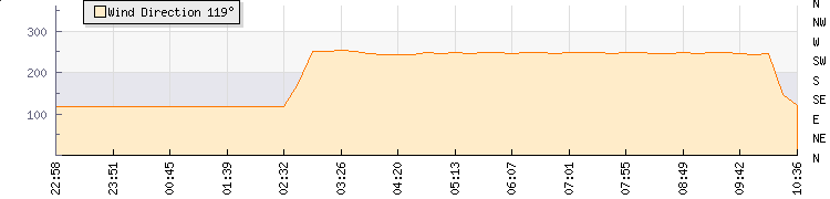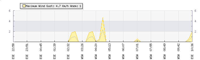 In the last few minutes the wind was West South West at an average speed of 0 kmh, reaching up to 0 kmh and a low of 0 kmh. The gust strength is0 kmh above the minimum speed |