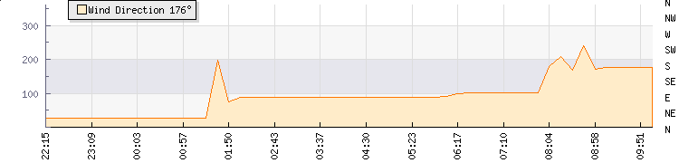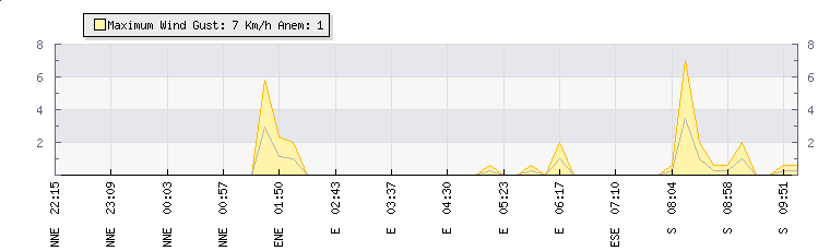 In the last few minutes the wind was South South West at an average speed of 4 kmh, reaching up to 7 kmh and a low of 0 kmh. The gust strength is7 kmh above the minimum speed |