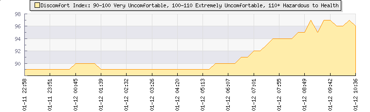 | Wind Speed: | 0|0|0 kmh | Wind Direction: | WSW 246° | Temperature: | 25.5°C | | Wet Bulb: | 25°C | Discomfort: | 99 | Humidity: | 96% | | Rainfall Today: | 1.3mm | 12 hrs Rainfall: | 3.7mm | 24 hrs Rainfall: | 25.7mm | | Barometer: | 1014.5mb | Dew Point: | 24.8°C | Clouds AGL: | 275ft (84 m) | | Density-Alt: | 2356ft (718 m) | Fire Danger: | |