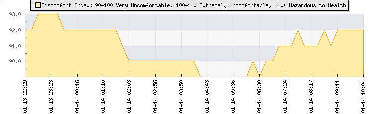 | Wind Speed: | 0|4|7 kmh | Wind Direction: | SSW 209° | Temperature: | 23.5°C | | Wet Bulb: | 23.3°C | Discomfort: | 94 | Humidity: | 98% | | Rainfall Today: | 10.9mm | 12 hrs Rainfall: | 11.7mm | 24 hrs Rainfall: | 13.2mm | | Barometer: | 1012mb | Dew Point: | 23.2°C | Clouds AGL: | 134ft (41 m) | | Density-Alt: | 2178ft (664 m) | Solar Radiation: | 293Wm² | Fire Danger: | |