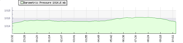 | Wind Speed: | 0|1|2 kmh | Wind Direction: | SSE 151° | Temperature: | 30.5°C | | Wet Bulb: | 24.9°C | Discomfort: | 104 | Humidity: | 63% | | Rainfall Today: | 0mm | 12 hrs Rainfall: | 0mm | 24 hrs Rainfall: | 0mm | | Barometer: | 1015.5mb | Dew Point: | 22.6°C | Clouds AGL: | 3144ft (958 m) | | Density-Alt: | 2831ft (863 m) | Solar Radiation: | 1962Wm² | Fire Danger: | |
