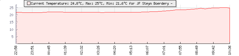 | Wind Gust: | 5 km/h | Min Temp: | 22.6 °C | Max Temp: | 25.5 °C | | Wind Average: | 2 km/h | Min Hum: | 95 % | Max Hum: | 99 % | |  |