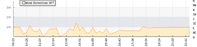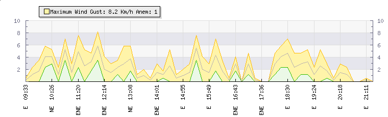 In the last few minutes the wind was Easterly at an average speed of 1 kmh, reaching up to 1 kmh and a low of 0 kmh. The gust strength is1 kmh above the minimum speed |