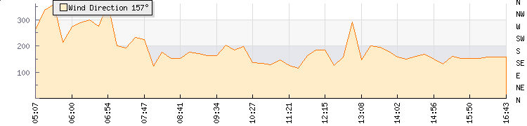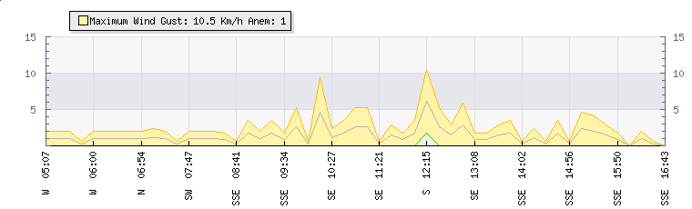 In the last few minutes the wind was South South East at an average speed of 1 kmh, reaching up to 3 kmh and a low of 0 kmh. The gust strength is3 kmh above the minimum speed |
