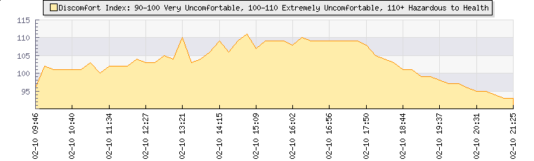 | Wind Speed: | 0|1|1 kmh | Wind Direction: | E 95° | Temperature: | 27.3°C | | Wet Bulb: | 24°C | Discomfort: | 99 | Humidity: | 76% | | Rainfall Today: | 0mm | 12 hrs Rainfall: | 0mm | 24 hrs Rainfall: | 0mm | | Barometer: | 1013.4mb | Dew Point: | 22.7°C | Clouds AGL: | 1845ft (562 m) | | Density-Alt: | 2549ft (777 m) | Fire Danger: | |