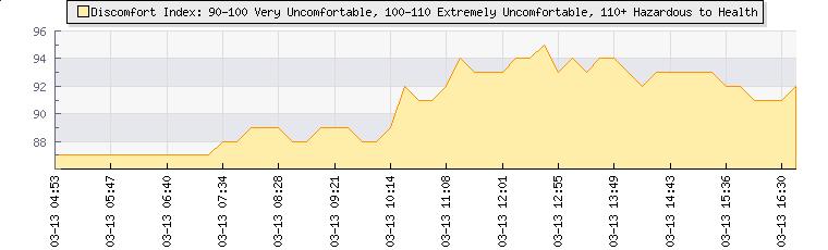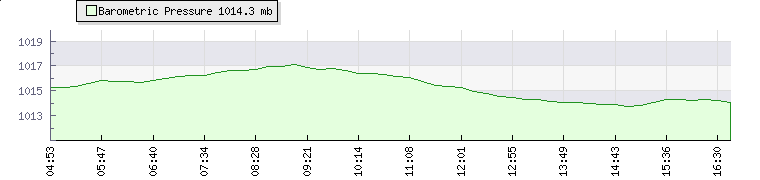 | Wind Speed: | 0|1|3 kmh | Wind Direction: | SSE 153° | Temperature: | 24.7°C | | Wet Bulb: | 23.3°C | Discomfort: | 95 | Humidity: | 89% | | Rainfall Today: | 5.8mm | 12 hrs Rainfall: | 5.8mm | 24 hrs Rainfall: | 6.4mm | | Barometer: | 1014.6mb | Dew Point: | 22.7°C | Clouds AGL: | 776ft (237 m) | | Density-Alt: | 2215ft (675 m) | Fire Danger: | |